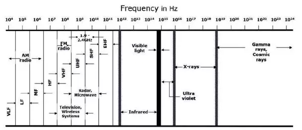 The electromagnetic spectrum refers to the full range of frequencies at which electromagnetic waves exist. Different frequency ranges are used for various applications. For example, AM radio operates between 550 kHz and 1640 kHz, while FM radio uses the 88 MHz to 108 MHz range. Visible light lies between 429 THz and 750 THz, which is the range our eyes can detect. Infrared radiation, just below visible light, allows us to sense heat.